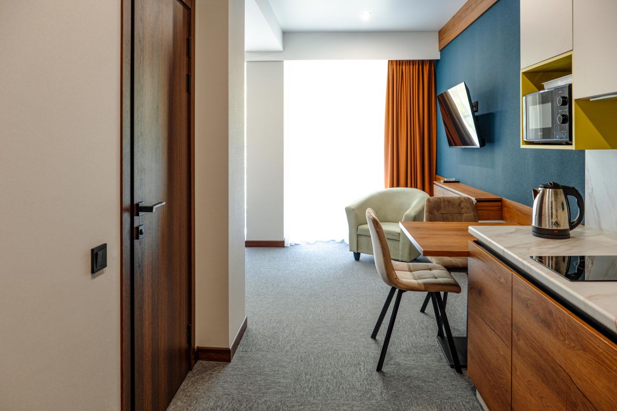 3-местные и семейные 5-местные апартаменты. Отель находится всего в 50 метрах от пляжа — с 1 по 3 этаж вы сможете любоваться панорамой города и гор, а с 4 этажа откроется захватывающий вид на морскую бездну. На крыше отеля расположен бассейн и площадка с искусственной травой, идеальные для утренних занятий йогой и медитацией на фоне красоты рассветов и закатов.